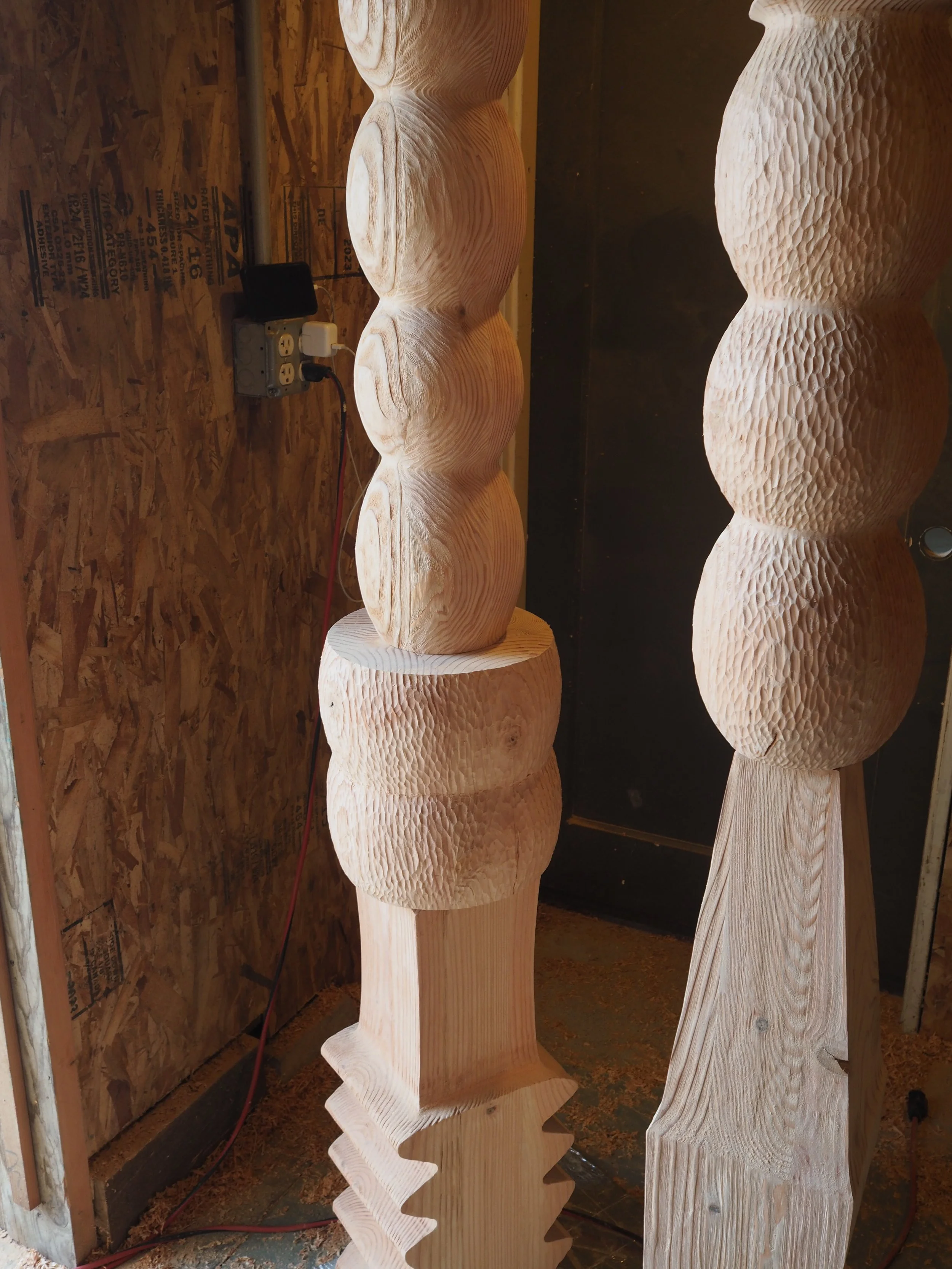 The project used reclaimed douglas fir and involved a mix of power and hand carving techniques. 10 plinths were manufactured in total with 4 of them designed for disassembly.